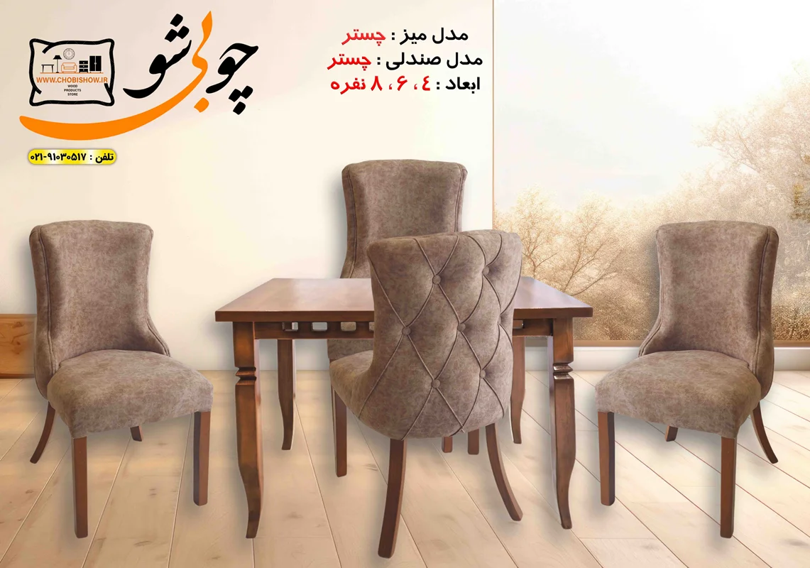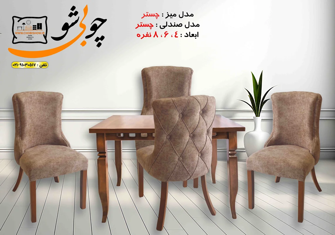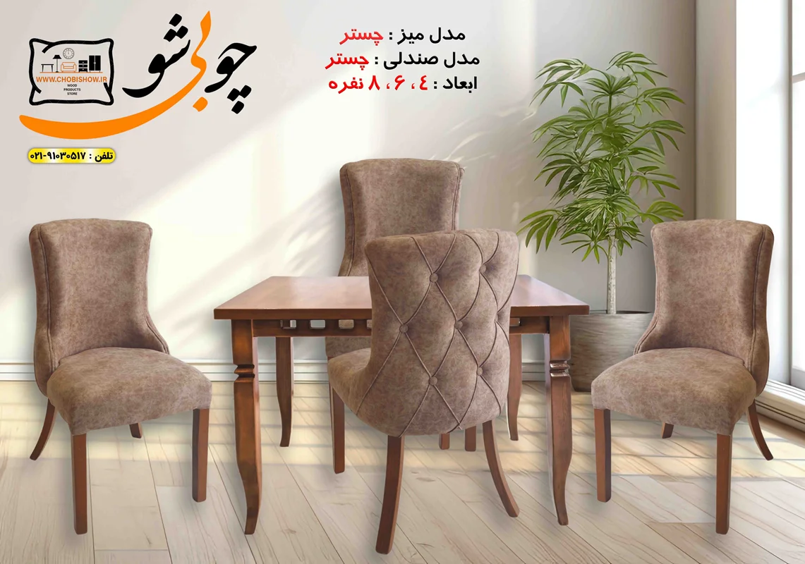 اگر بخواهیم طرحی خاص برای بخش غذاخوری منزل شما معرفی کنیم که در جذابیت و زیبایی بی نظیر باشد قطعا مدل چستر را پیشنهاد میکنیم. ابعاد این میز قابل سفارش در سایز های 4 نفره ، 6 نفره و 8 نفره ، 10 نفره میباشد. این مدل زیبا از مدل های جدید در عرصه میز و صندلی ناهارخوری میباشد. شما عزیزان میتوانید این میز ناهار خوری زیبا را با صندلی مدل چستر به صورت ست سفارش دهید. رنگ بندی میز مدل چستر کاملا به سلیقه شما و رنگ دلخواه شما انجام میشود. بعد از ثبت سفارش شما همکاران ما در خط تولید با شما تماس گرفته و تمامی کالیته رنگهای پارچه و چوب را در اختیار شما قرار میدهند که شما با حوصله انتخاب کنید و ما سلیقه شما را تولید کنیم. قیمت پایه قیمت میز 4 نفره میباشد که میتوانید صندلی های چستر را نیز به سبد خرید خود اضافه کنید.مدت زمان ساخت و ارسال این میز زیبا با رنگ دلخواه شما 5 روز کاری میباشد .برای هماهنگی قبل از خرید و سوالات خود نیز میتوانید با شماره ۰۲۱۹۱۰۳۰۵۱۷ تماس حاصل فرمایید. چوبی شو کیفیت را به قیمت تولید به شما عزیزان ارائه میدهد.