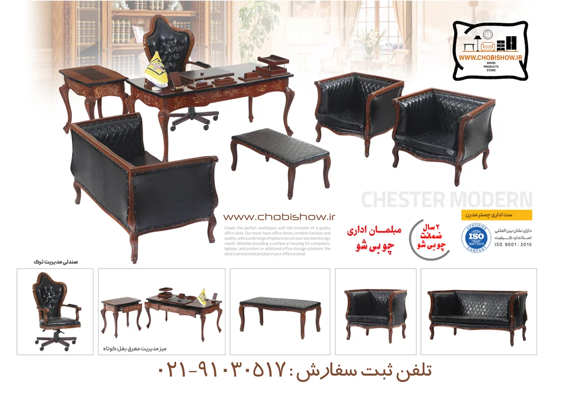 اگر به دنبال زیبایی بی حد و مرز برای دفتر کاری خود هستید به شدت پیشنهاد میکنیم از ست مبلمان و مدیریتی اداری مدل چستر مدرن استفاده کنید. این مدل زیبا جلوه ی خاص و زیبایی را به دفتر کار شما میدهد. جنس پایه استفاده شده در این مدل زیبا راش گرجستان میباشد و بدنه ی محصول از ام دی اف با روکش طبیعی چوب بوده و قابل سفارش به رنگ دلخواه شما میباشد. شما میتوانید هم رنگ چوب و هم رنگ پارچه این سِت زیبا را به دلخواه خود با تم رنگی دفتر خود سفارش دهید.این ست زیبا با 24 ماه ضمانت بی قید و شرط خدمت شما ارسال میگردد.مدت زمان تحویل این مدل زیبا 15 روز کاری میباشد.