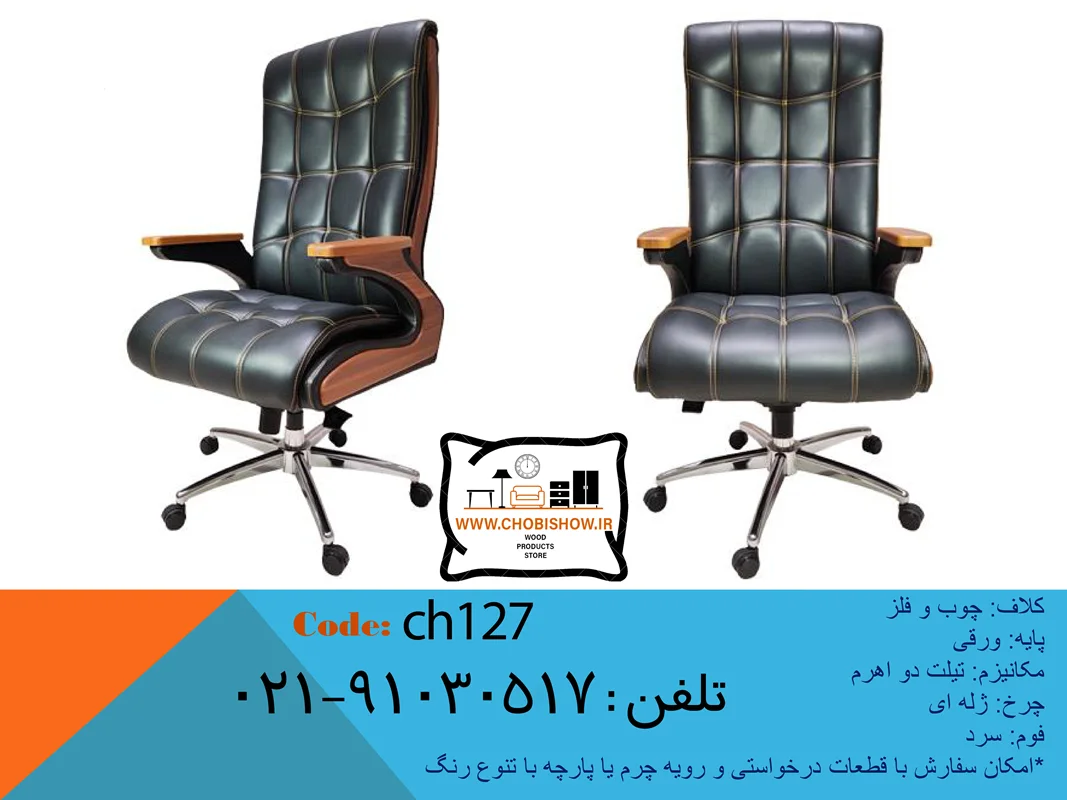 صندلی مدیریت مدل CH127 گروه تولیدی چوبی شو ساخته شده از بهترین متریال های موجود در بازار می باشد و این امر سبب گردیده تا ما بتوانیم بهترین کیفیت را به همراه بهترین قیمت تقدیم مشتریان عزیز گروه تولیدی چوبی شو نماییم.کلاف بدنه های این صندلی زیبا از جنس چوب بوده و دارای پایه های کروم میباشد.همچنین از فوم سرد درجه1 در ساخت نشیمن این محصول زیبا استفاده گردیده است تا شما عزیزان نشیمن راحتی را داشته باشید. مدت زمان تحویل 4 روز کاری پس از ثبت سفارش شما میباشد.