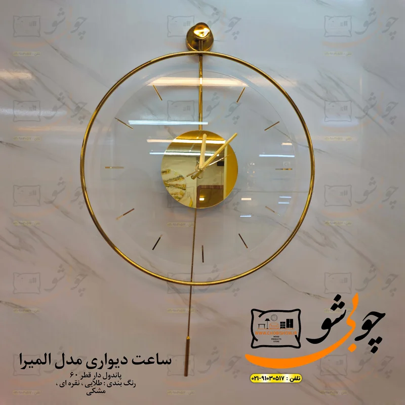 اگر به دنبال یک ساعت خاص و بی همتا هستید قطعاً ساعت دیواری مدل المیرای کمپانی چوبی شو را به شما عزیزان پیشنهاد میکنیم. این ساعت دیواری زیبا از متریال فلزی(آهن) ساخته شده که بعد از مراحل نَوَرد و جوشکاری وارد بخش آبکاری می شود. که به رنگ های نقره ای و طلایی قابل سفارش است البته میتوانید به رنگ کوره ای مشکی نیز ثبت سفارش کنید که با قیمت پایین تری قابل خرید است. موتور و پاندول ساعت دیواری المیرا تایوانی بوده و شامل ۳۶ ماه ضمانت بی قید و شرط کمپانی چوبی شو میباشد. ویدئوی ساعت دیواری المیرا را میتوانید به راحتی در انتهای همین صفحه مشاهده کنید. مدت زمان تحویل۴ روز بعد از ثبت سفارش شما عزیزان میباشد. رنگ مشکی ۲ روزه میباشد. جهت مشاوره و در یافت اطلاعات بیشتر نیز میتوانید با پشتیبانی ۲۴ ساعته چوبی شو با شماره ۰۲۱۹۱۰۳۰۵۱۷ تماس حاصل فرمایید.