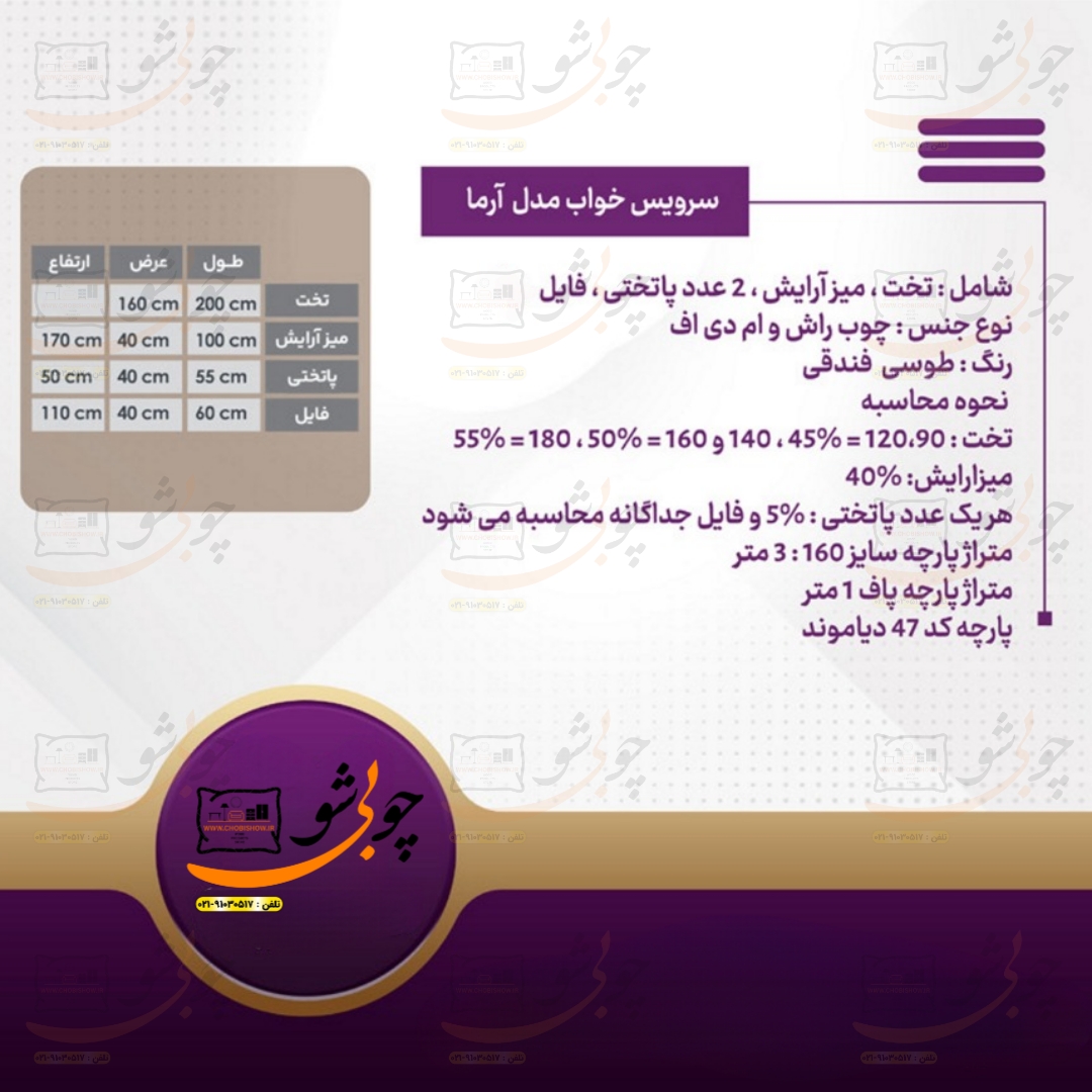 کمپانی چوبی شو یک سیستم یکپارچه تولید محصولات دکوراسیون میباشد که به راحتی جهت رفاه مشتریان عزیز محصولات خود را با قیمت تولید مستقیماً از طریق وب سایت رسمی خود www.chobishow.ir به شما عزیزان ارائه میکند. سرویس خواب مدل آرما از تولیدات جدید کمپانی چوبی شو میباشد که تمامی مراحل ساخت تولید آن در خود کمپانی صورت میپذیرد. جهت انتخاب رنگ بعد از ثبت سفارش شما همکاران ما در پشتیبانی تماس گرفته و مشاوره کاملی را خدمت شما عزیزان ارائه میدهند.