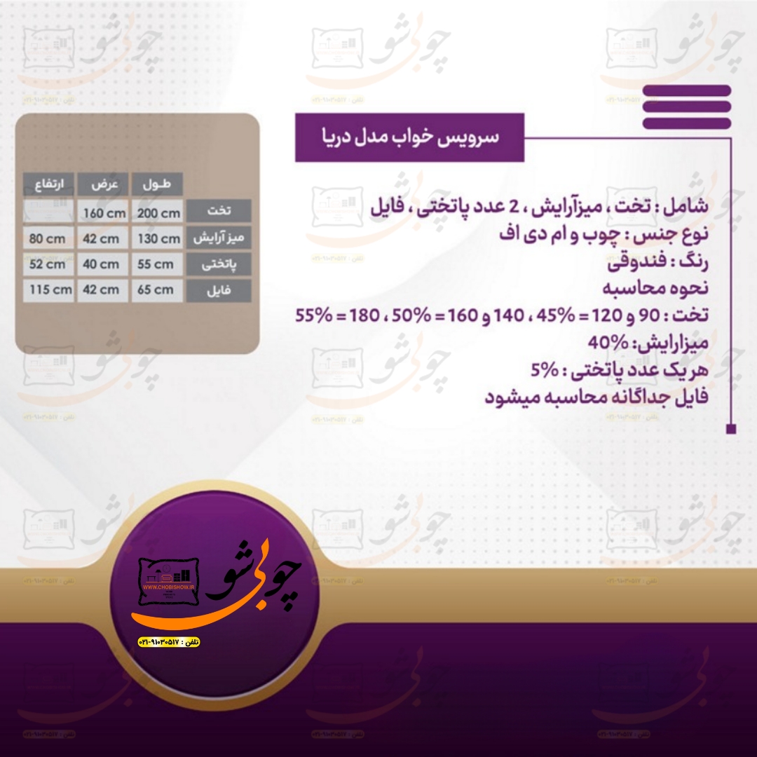 کمپانی چوبی شو یک سیستم یکپارچه تولید محصولات دکوراسیون میباشد که به راحتی جهت رفاه مشتریان عزیز محصولات خود را با قیمت تولید مستقیماً از طریق وب سایت رسمی خود www.chobishow.ir به شما عزیزان ارائه میکند. سرویس خواب مدل دریا از تولیدات جدید کمپانی چوبی شو میباشد که تمامی مراحل ساخت تولید آن در خود کمپانی صورت میپذیرد. جهت انتخاب رنگ بعد از ثبت سفارش شما همکاران ما در پشتیبانی تماس گرفته و مشاوره کاملی را خدمت شما عزیزان ارائه میدهند.