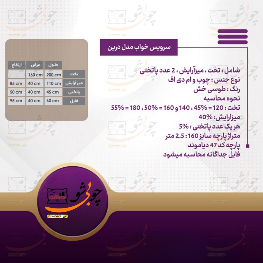 کمپانی چوبی شو یک سیستم یکپارچه تولید محصولات دکوراسیون میباشد که به راحتی جهت رفاه مشتریان عزیز محصولات خود را با قیمت تولید مستقیماً از طریق وب سایت رسمی خود www.chobishow.ir به شما عزیزان ارائه میکند. سرویس خواب مدل درین از تولیدات جدید کمپانی چوبی شو میباشد که تمامی مراحل ساخت تولید آن در خود کمپانی صورت میپذیرد. جهت انتخاب رنگ بعد از ثبت سفارش شما همکاران ما در پشتیبانی تماس گرفته و مشاوره کاملی را خدمت شما عزیزان ارائه میدهند.