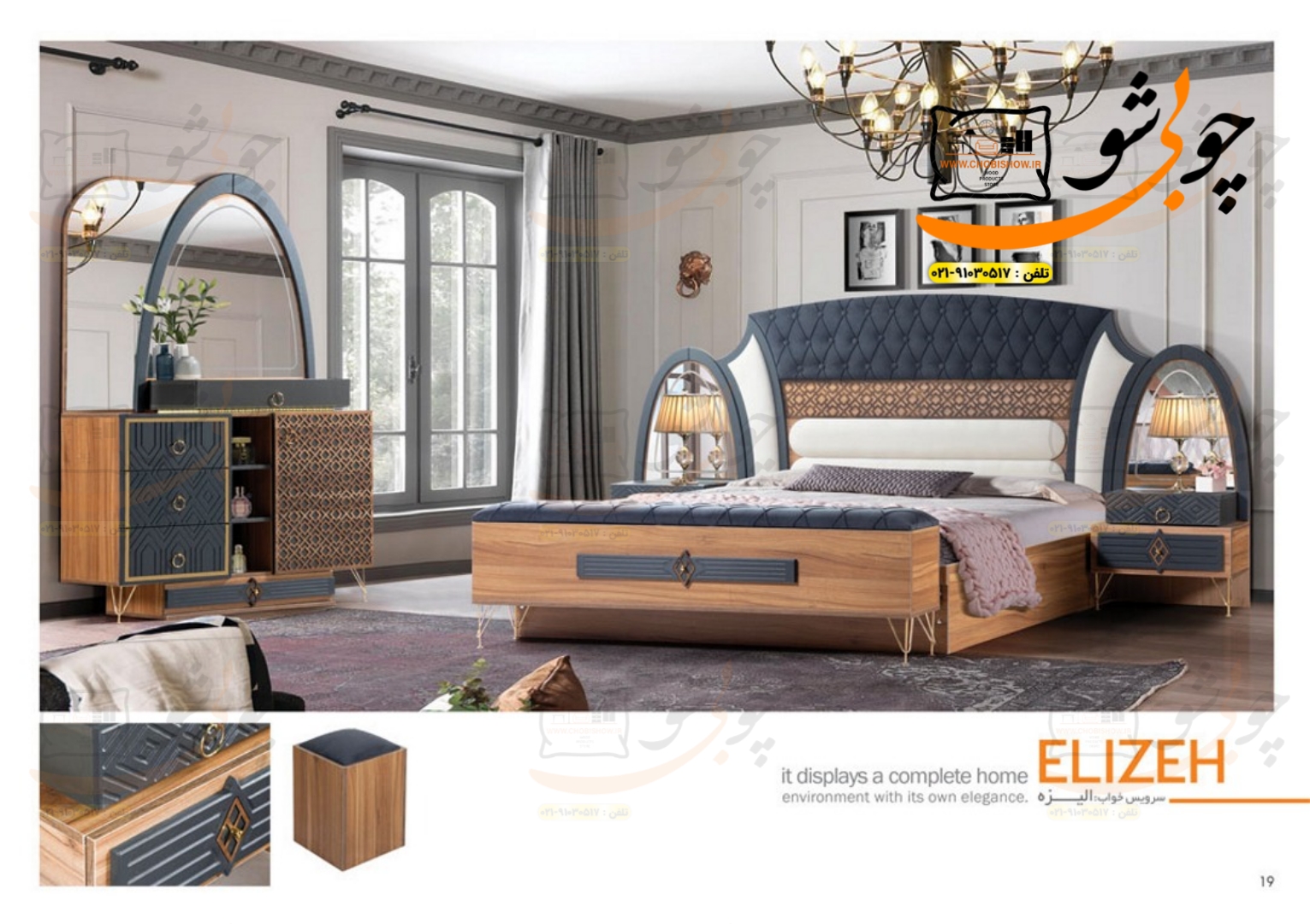 به دنیای رویایی و راحتی با سرویس خواب مدل الیزه وارد شوید! طراحی شیک و منحصر به فرد این سرویس خواب، زیبایی بینظیری به اتاقخواب شما میبخشد. با کیفیت بالا و دوام عالی، الیزه خواب آرام و لذتبخشی را تضمین میکند. شما عزیزان میتوانید به راحتی از طریق همین صفحه این سرویس خواب زیبا را با رنگ پارچه دلخواه ثبت سفارش کنید تا گروه تولید چوبی شو فقط در مدت زمان ۲۰ روز کاری این سرویس خواب زیبا را با رنگ درخواستی شما تولید و به دست شما عزیزان در هر نقطه از کشور برساند. شما عزیزان برای سوالات و مشاوره میتوانید با پشتیبانی ۲۴ ساعته گروه تولید چوبیشو به شماره ۰۲۱۹۱۰۳۰۵۱۷ (داخلی ۱۰۰) تماس حاصل فرمایید. بدیهیست همکاران ما به تمام سوالات شما در مورد سرویس خواب الیزه پاسخی کامل خواهند داد. شماره واتساپ ۰۹۱۲۴۱۳۴۵۹۰ . همین امروز تجربهی خواب ایدهآل را آغاز کنید و آرامش واقعی را احساس کنید!