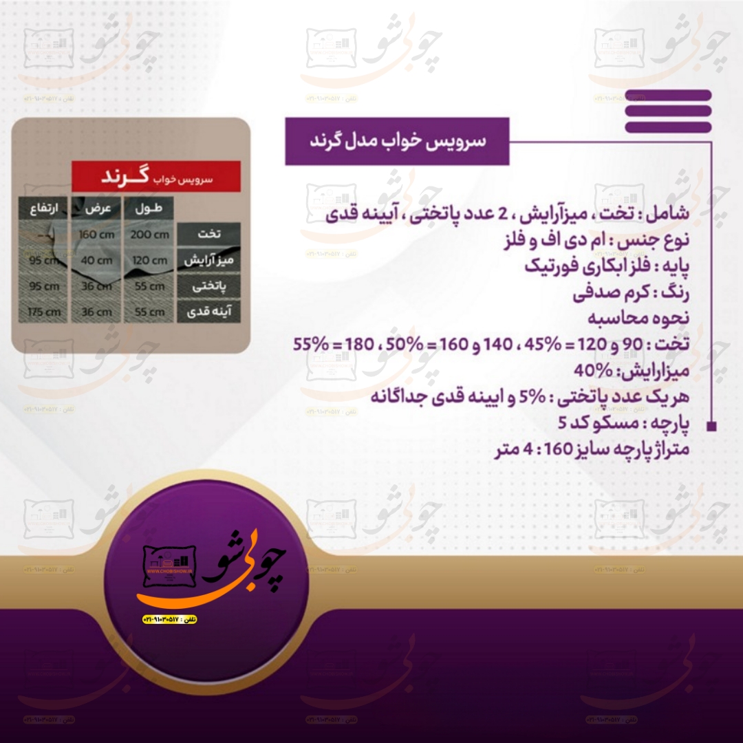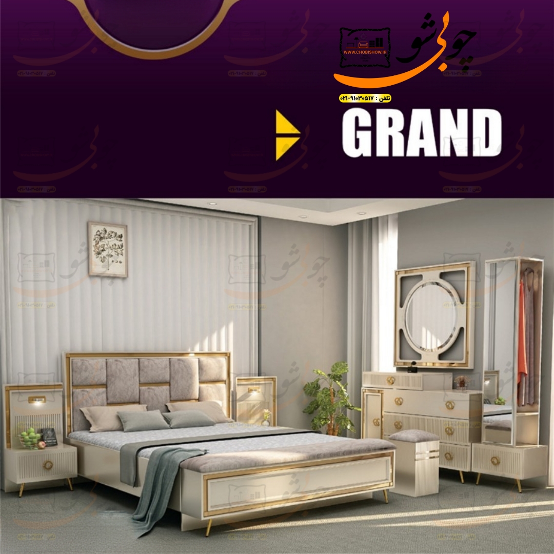 با سرویس خواب مدل گرند، تجربهی خوابی شاهانه را از آن خود کنید! طراحی شیک و اصالت بینظیر این محصول، فضای اتاق خواب شما را به یک بهشت آرامشبخش تبدیل میکند. با کیفیت بالای متریال و ساخت دقیق، شما شایستهی بهترینها هستید. شما عزیزان میتوانید به راحتی از طریق همین صفحه این سرویس خواب زیبا را ثبت سفارش کنید تا گروه تولید چوبی شو فقط در مدت زمان ۲۰ روز کاری این سرویس خواب زیبا را تولید و به دست شما عزیزان در هر نقطه از کشور برساند. شما عزیزان برای سوالات و مشاوره میتوانید با پشتیبانی ۲۴ ساعته گروه تولید چوبیشو به شماره ۰۲۱۹۱۰۳۰۵۱۷ (داخلی ۱۰۰) تماس حاصل فرمایید. بدیهیست همکاران ما به تمام سوالات شما در مورد سرویس خواب گرند پاسخی کامل خواهند داد. شماره واتساپ ۰۹۱۲۴۱۳۴۵۹۰ . همین حالا رنگ و سایز دلخواهتان را انتخاب کنید و لذت ببرید! ۰۸
