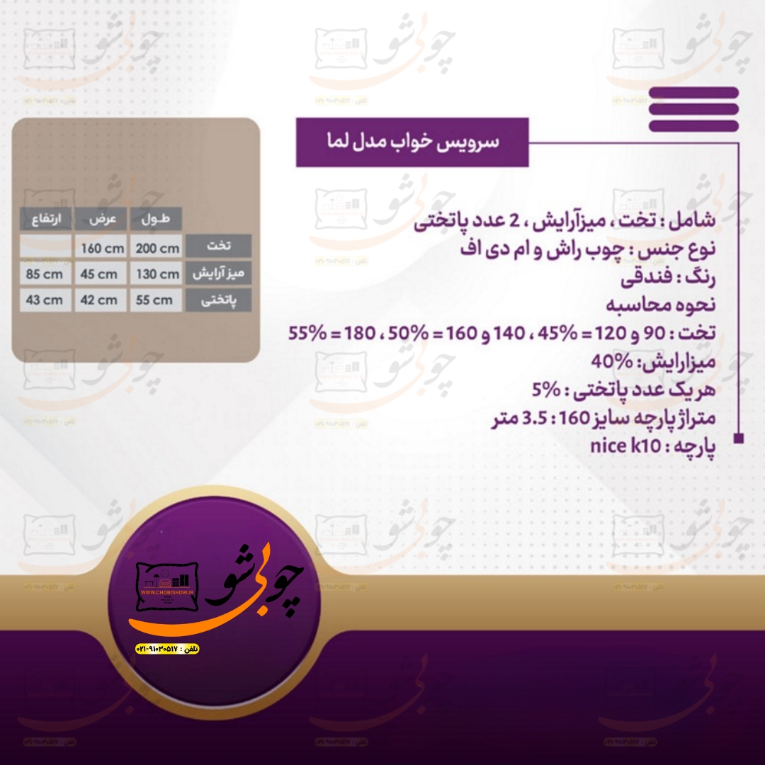 کمپانی چوبی شو یک سیستم یکپارچه تولید محصولات دکوراسیون میباشد که به راحتی جهت رفاه مشتریان عزیز محصولات خود را با قیمت تولید مستقیماً از طریق وب سایت رسمی خود www.chobishow.ir به شما عزیزان ارائه میکند. سرویس خواب مدل لما از تولیدات جدید کمپانی چوبی شو میباشد که تمامی مراحل ساخت تولید آن در خود کمپانی صورت میپذیرد. جهت انتخاب رنگ بعد از ثبت سفارش شما همکاران ما در پشتیبانی تماس گرفته و مشاوره کاملی را خدمت شما عزیزان ارائه میدهند.