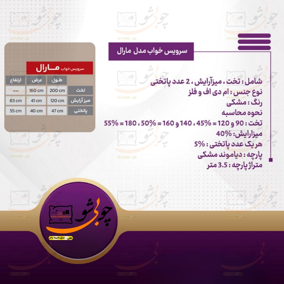 کمپانی چوبی شو یک سیستم یکپارچه تولید محصولات دکوراسیون میباشد که به راحتی جهت رفاه مشتریان عزیز محصولات خود را با قیمت تولید مستقیماً از طریق وب سایت رسمی خود www.chobishow.ir به شما عزیزان ارائه میکند. سرویس خواب مدل مارال از تولیدات جدید کمپانی چوبی شو میباشد که تمامی مراحل ساخت تولید آن در خود کمپانی صورت میپذیرد. جهت انتخاب رنگ بعد از ثبت سفارش شما همکاران ما در پشتیبانی تماس گرفته و مشاوره کاملی را خدمت شما عزیزان ارائه میدهند.