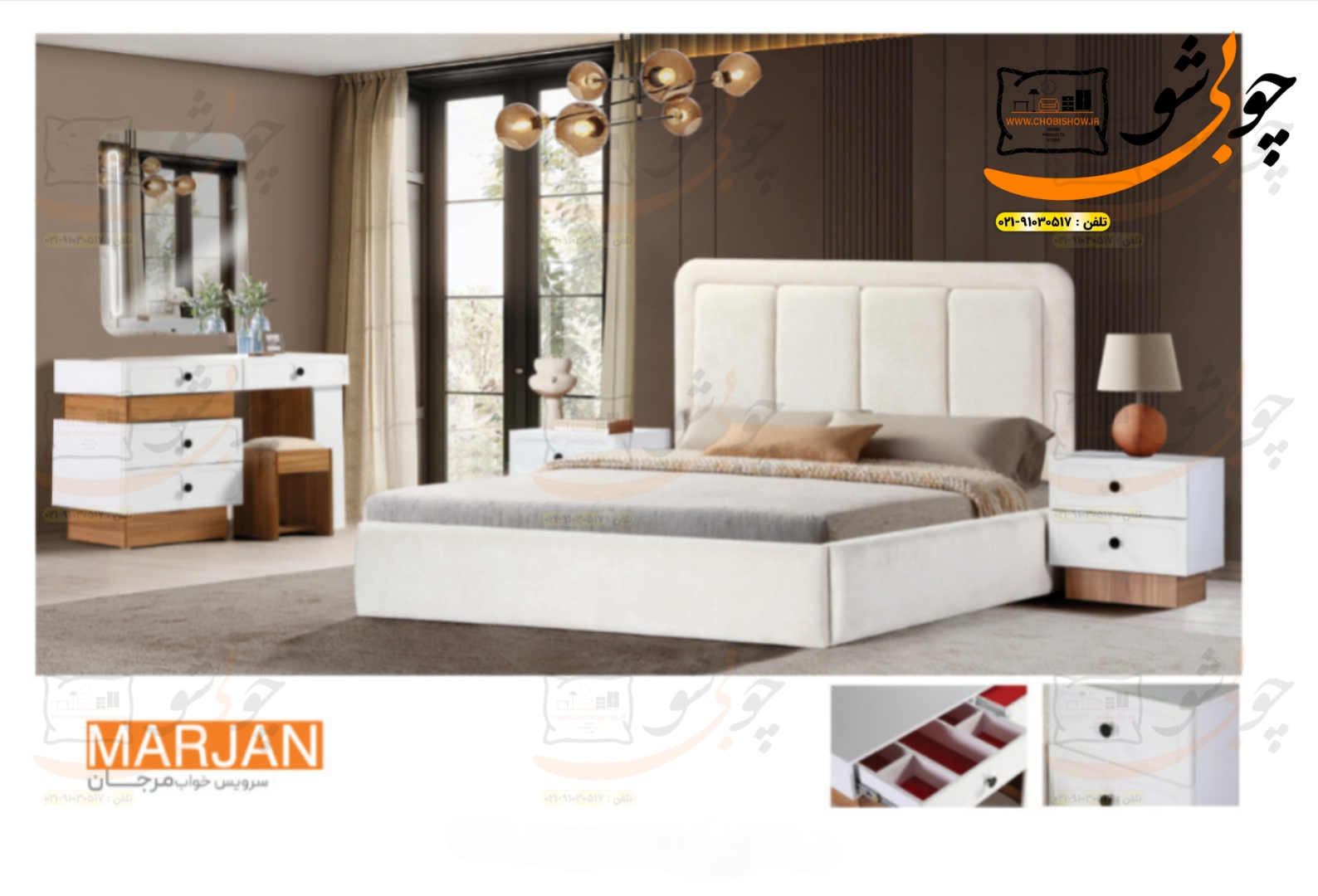 سرویس خواب مدل مرجان، ترکیبی استثنایی از راحتی و زیبایی برای هر اتاق خواب. طراحی مدرن و جذاب آن به فضای شما شکوه و آرامش میبخشد. ساخته شده از مواد با کیفیت بالا، این سرویس خواب تضمینی برای خوابی عمیق و لذتبخش است. شما عزیزان میتوانید به راحتی از طریق همین صفحه این سرویس خواب زیبا را ثبت سفارش کنید تا گروه تولید چوبی شو فقط در مدت زمان ۲۰ روز کاری این سرویس خواب زیبا را تولید و به دست شما عزیزان در هر نقطه از کشور برساند. شما عزیزان برای سوالات و مشاوره میتوانید با پشتیبانی ۲۴ ساعته گروه تولید چوبیشو به شماره ۰۲۱۹۱۰۳۰۵۱۷ (داخلی ۱۰۰) تماس حاصل فرمایید. بدیهیست همکاران ما به تمام سوالات شما در مورد سرویس خواب مدل مرجان پاسخی کامل خواهند داد. شماره واتساپ ۰۹۱۲۴۱۳۴۵۹۰ . همین حالا خرید کنید و تجربهی خواب رویایی را به خانهتان بیاورید! ۰۳