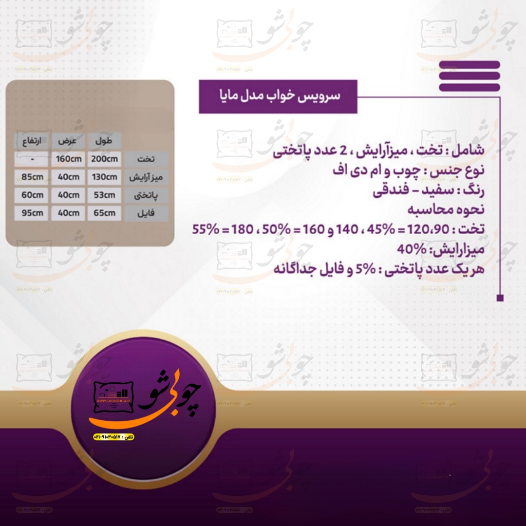 کمپانی چوبی شو یک سیستم یکپارچه تولید محصولات دکوراسیون میباشد که به راحتی جهت رفاه مشتریان عزیز محصولات خود را با قیمت تولید مستقیماً از طریق وب سایت رسمی خود www.chobishow.ir به شما عزیزان ارائه میکند. سرویس خواب مدل مایا از تولیدات جدید کمپانی چوبی شو میباشد که تمامی مراحل ساخت تولید آن در خود کمپانی صورت میپذیرد. جهت انتخاب رنگ بعد از ثبت سفارش شما همکاران ما در پشتیبانی تماس گرفته و مشاوره کاملی را خدمت شما عزیزان ارائه میدهند.