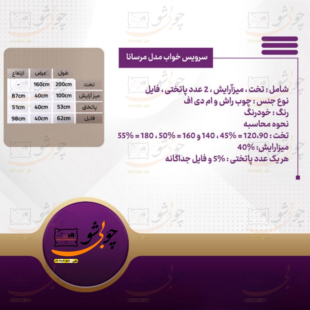 کمپانی چوبی شو یک سیستم یکپارچه تولید محصولات دکوراسیون میباشد که به راحتی جهت رفاه مشتریان عزیز محصولات خود را با قیمت تولید مستقیماً از طریق وب سایت رسمی خود www.chobishow.ir به شما عزیزان ارائه میکند. سرویس خواب مدل مرسانا از تولیدات جدید کمپانی چوبی شو میباشد که تمامی مراحل ساخت تولید آن در خود کمپانی صورت میپذیرد. جهت انتخاب رنگ بعد از ثبت سفارش شما همکاران ما در پشتیبانی تماس گرفته و مشاوره کاملی را خدمت شما عزیزان ارائه میدهند.
