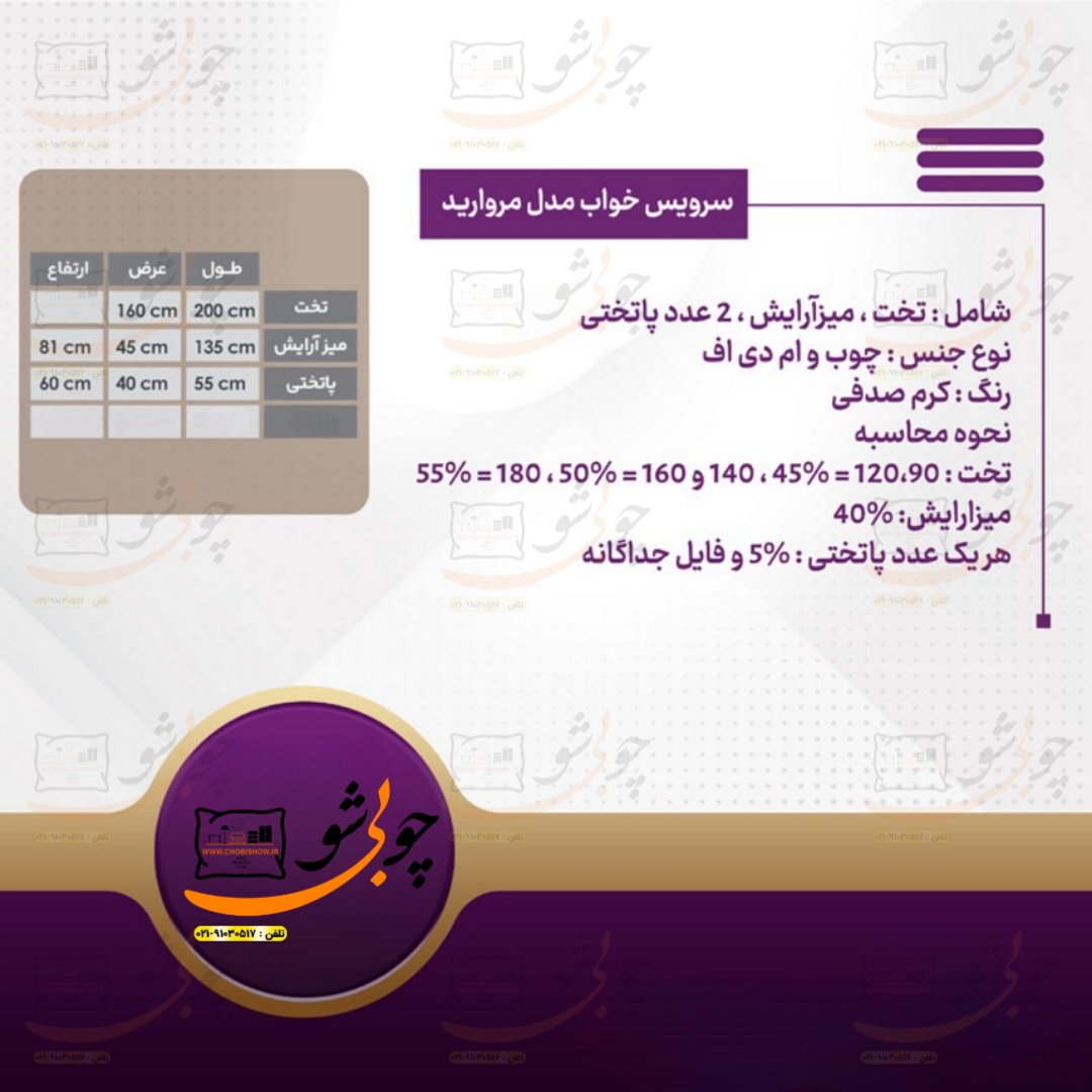 کمپانی چوبی شو یک سیستم یکپارچه تولید محصولات دکوراسیون میباشد که به راحتی جهت رفاه مشتریان عزیز محصولات خود را با قیمت تولید مستقیماً از طریق وب سایت رسمی خود www.chobishow.ir به شما عزیزان ارائه میکند. سرویس خواب مدل مروارید از تولیدات جدید کمپانی چوبی شو میباشد که تمامی مراحل ساخت تولید آن در خود کمپانی صورت میپذیرد. جهت انتخاب رنگ بعد از ثبت سفارش شما همکاران ما در پشتیبانی تماس گرفته و مشاوره کاملی را خدمت شما عزیزان ارائه میدهند.