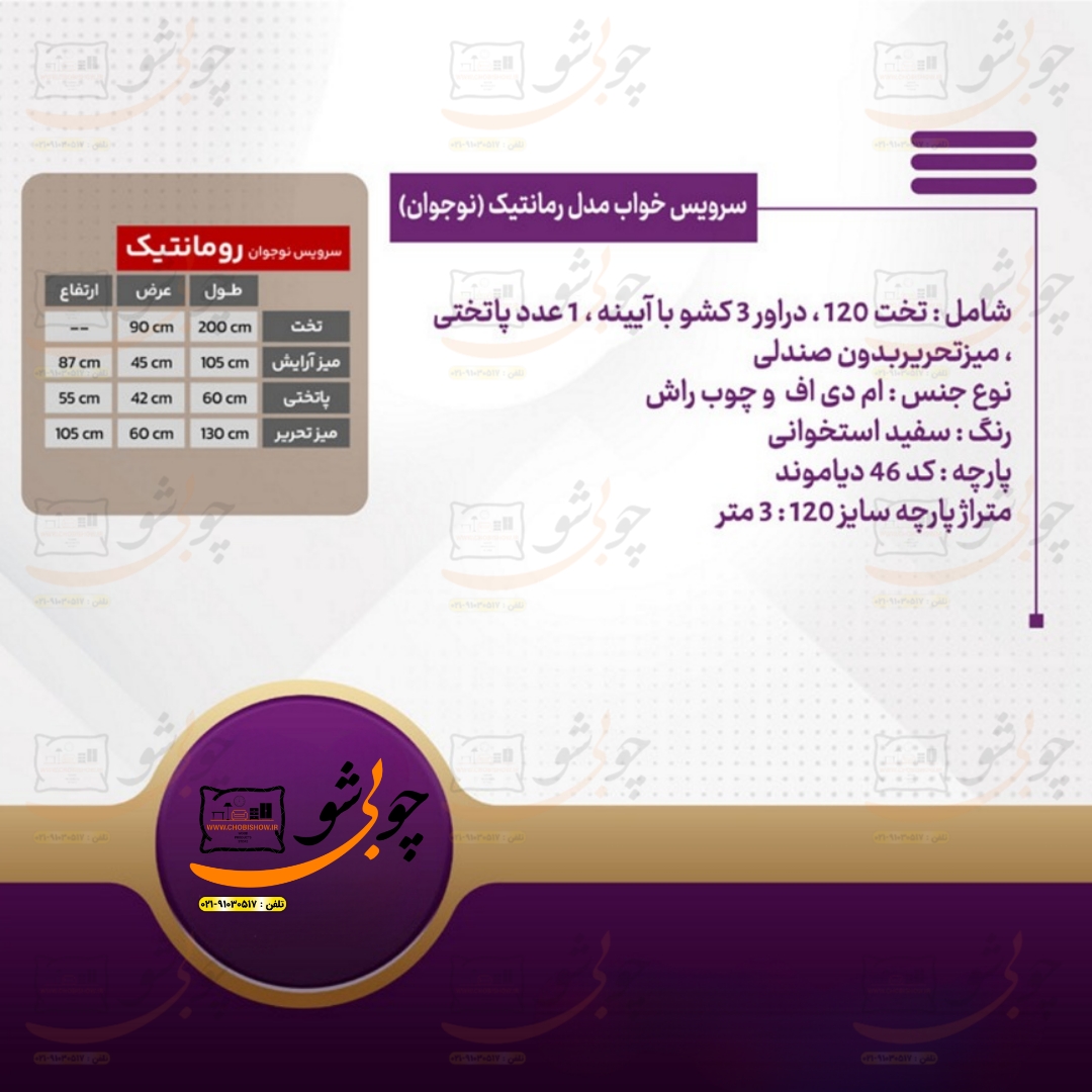 کمپانی چوبی شو یک سیستم یکپارچه تولید محصولات دکوراسیون میباشد که به راحتی جهت رفاه مشتریان عزیز محصولات خود را با قیمت تولید مستقیماً از طریق وب سایت رسمی خود www.chobishow.ir به شما عزیزان ارائه میکند. سرویس خواب نوجوان مدل رومانتیک از تولیدات جدید کمپانی چوبی شو میباشد که تمامی مراحل ساخت تولید آن در خود کمپانی صورت میپذیرد. جهت انتخاب رنگ بعد از ثبت سفارش شما همکاران ما در پشتیبانی تماس گرفته و مشاوره کاملی را خدمت شما عزیزان ارائه میدهند.