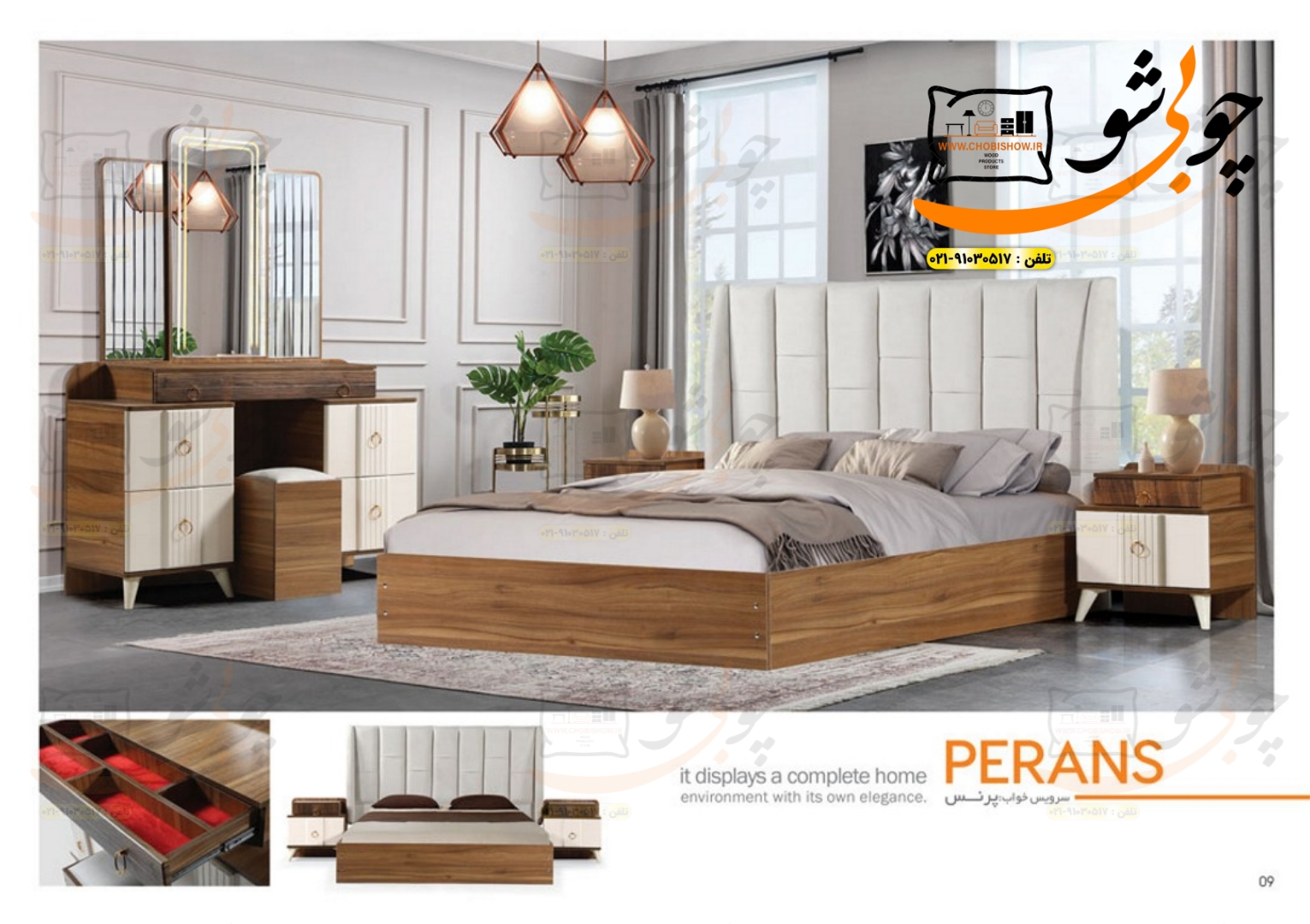 با سرویس خواب مدل پرنس، تجربهای از آرامش و شکوه را به اتاق خواب خود بیاورید! طراحی بینظیر و کیفیت منحصربهفرد این سرویس، محیطی لوکس و دلنشین را برای شما فراهم میکند. از خواب راحت و بیدغدغه لذت ببرید و با استایلی خاص، جلوهای تازه به فضای خواب خود ببخشید. شما عزیزان میتوانید به راحتی از طریق همین صفحه این سرویس خواب زیبا را با رنگ پارچه دلخواه ثبت سفارش کنید تا گروه تولید چوبی شو فقط در مدت زمان ۲۰ روز کاری این سرویس خواب زیبا را با رنگ درخواستی شما تولید و به دست شما عزیزان در هر نقطه از کشور برساند. شما عزیزان برای سوالات و مشاوره میتوانید با پشتیبانی ۲۴ ساعته گروه تولید چوبیشو به شماره ۰۲۱۹۱۰۳۰۵۱۷ تماس حاصل فرمایید. بدیهیست همکاران ما به تمام سوالات شما در مورد سرویس خواب پرنس پاسخی کامل خواهند داد. شماره واتساپ ۰۹۱۲۴۱۳۴۵۹۰ . همین حالا خرید کنید و تغییر را احساس کنید!