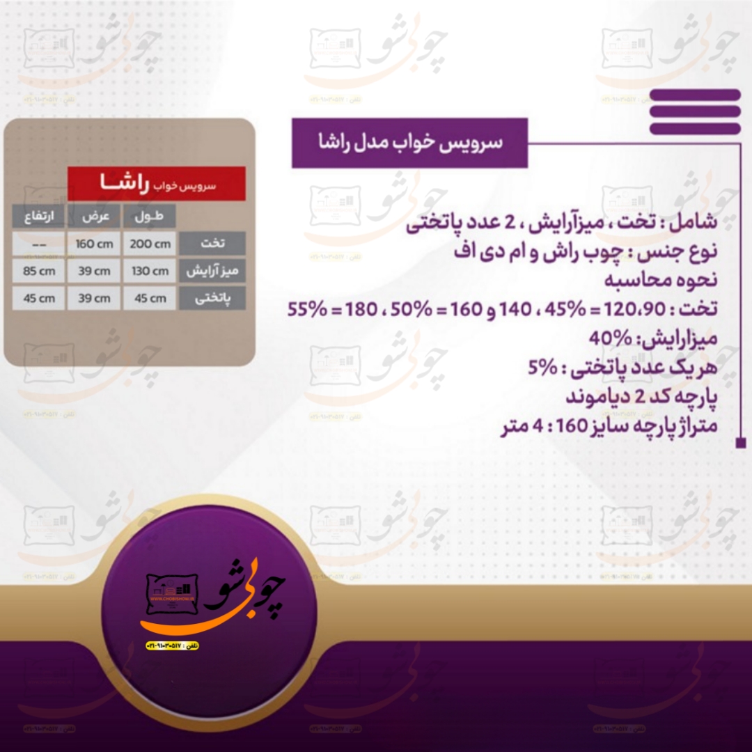 سرویس خواب مدل راشا، ترکیبی از ظرافت و استحکام که زیبایی و آرامش واقعی به اتاق خواب شما میبخشد. با طراحی مدرن و استفاده از مواد باکیفیت، خوابی عمیق و راحت را تجربه کنید. انتخابی ایدهآل برای افرادی که به دنبال لوکس بودن و ماندگاری هستند. شما عزیزان میتوانید به راحتی از طریق همین صفحه این سرویس خواب زیبا را ثبت سفارش کنید تا گروه تولید چوبی شو فقط در مدت زمان ۲۰ روز کاری این سرویس خواب زیبا را تولید و به دست شما عزیزان در هر نقطه از کشور برساند. شما عزیزان برای سوالات و مشاوره میتوانید با پشتیبانی ۲۴ ساعته گروه تولید چوبیشو به شماره ۰۲۱۹۱۰۳۰۵۱۷ (داخلی ۱۰۰) تماس حاصل فرمایید. بدیهیست همکاران ما به تمام سوالات شما در مورد سرویس خواب راشا پاسخی کامل خواهند داد. شماره واتساپ ۰۹۱۲۴۱۳۴۵۹۰ . همین حالا خرید کنید و لذت ببرید! ۰۸