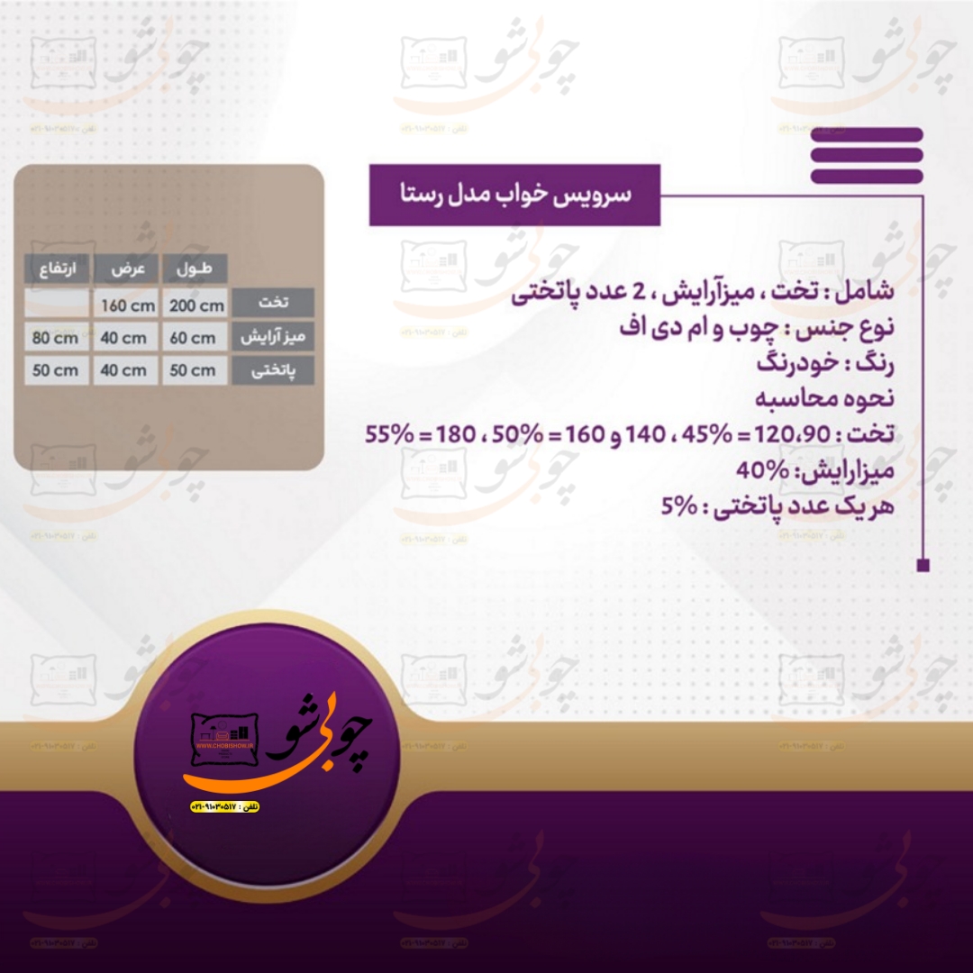 کمپانی چوبی شو یک سیستم یکپارچه تولید محصولات دکوراسیون میباشد که به راحتی جهت رفاه مشتریان عزیز محصولات خود را با قیمت تولید مستقیماً از طریق وب سایت رسمی خود www.chobishow.ir به شما عزیزان ارائه میکند. سرویس خواب مدل رستا از تولیدات جدید کمپانی چوبی شو میباشد که تمامی مراحل ساخت تولید آن در خود کمپانی صورت میپذیرد. جهت انتخاب رنگ بعد از ثبت سفارش شما همکاران ما در پشتیبانی تماس گرفته و مشاوره کاملی را خدمت شما عزیزان ارائه میدهند.