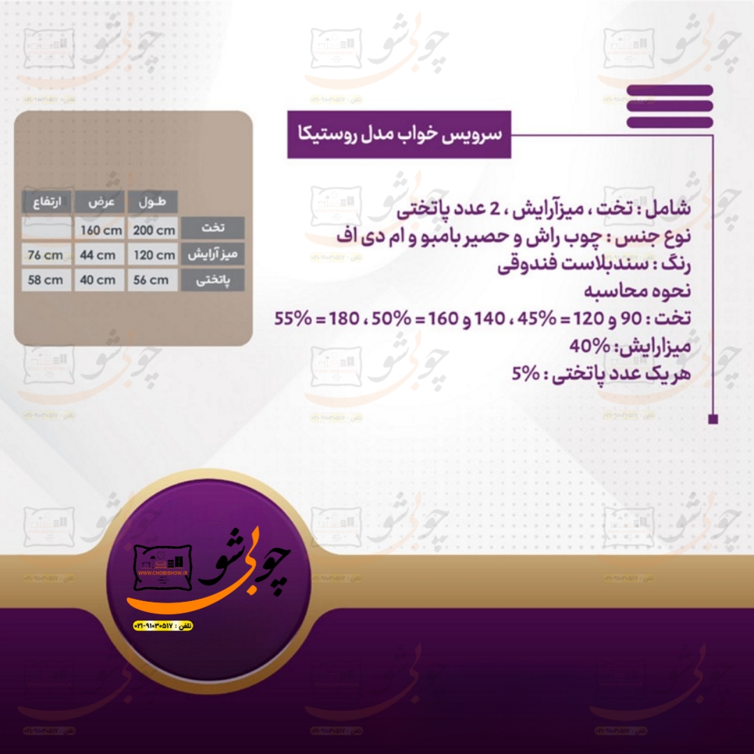 کمپانی چوبی شو یک سیستم یکپارچه تولید محصولات دکوراسیون میباشد که به راحتی جهت رفاه مشتریان عزیز محصولات خود را با قیمت تولید مستقیماً از طریق وب سایت رسمی خود www.chobishow.ir به شما عزیزان ارائه میکند. سرویس خواب مدل روستیکا از تولیدات جدید کمپانی چوبی شو میباشد که تمامی مراحل ساخت تولید آن در خود کمپانی صورت میپذیرد. جهت انتخاب رنگ بعد از ثبت سفارش شما همکاران ما در پشتیبانی تماس گرفته و مشاوره کاملی را خدمت شما عزیزان ارائه میدهند.