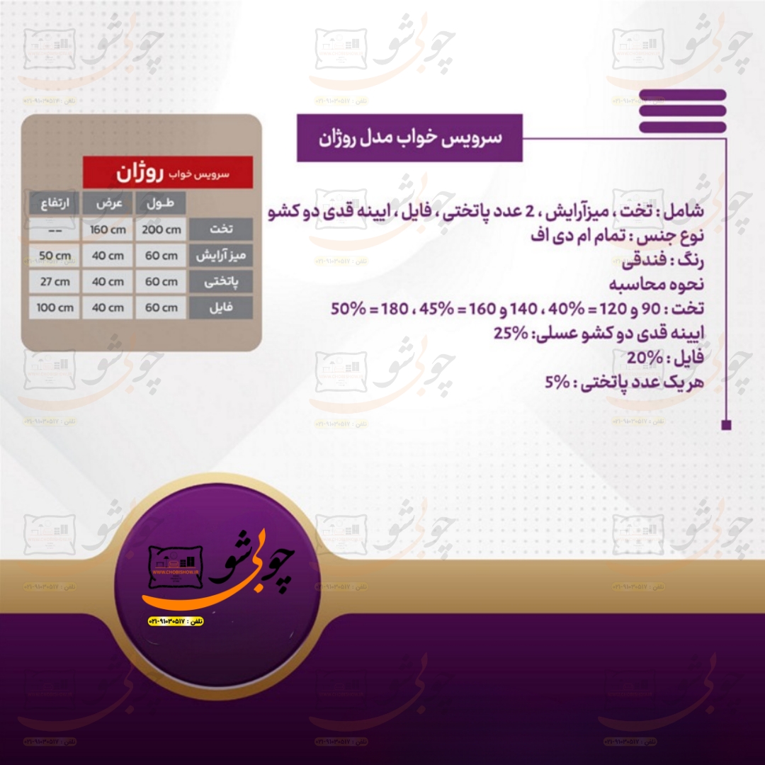 کمپانی چوبی شو یک سیستم یکپارچه تولید محصولات دکوراسیون میباشد که به راحتی جهت رفاه مشتریان عزیز محصولات خود را با قیمت تولید مستقیماً از طریق وب سایت رسمی خود www.chobishow.ir به شما عزیزان ارائه میکند. سرویس خواب مدل روژان از تولیدات جدید کمپانی چوبی شو میباشد که تمامی مراحل ساخت تولید آن در خود کمپانی صورت میپذیرد. جهت انتخاب رنگ بعد از ثبت سفارش شما همکاران ما در پشتیبانی تماس گرفته و مشاوره کاملی را خدمت شما عزیزان ارائه میدهند.