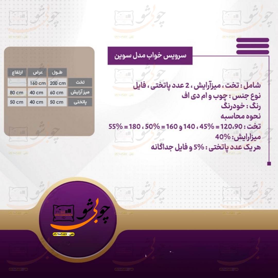 کمپانی چوبی شو یک سیستم یکپارچه تولید محصولات دکوراسیون میباشد که به راحتی جهت رفاه مشتریان عزیز محصولات خود را با قیمت تولید مستقیماً از طریق وب سایت رسمی خود www.chobishow.ir به شما عزیزان ارائه میکند. سرویس خواب مدل سوین از تولیدات جدید کمپانی چوبی شو میباشد که تمامی مراحل ساخت تولید آن در خود کمپانی صورت میپذیرد. جهت انتخاب رنگ بعد از ثبت سفارش شما همکاران ما در پشتیبانی تماس گرفته و مشاوره کاملی را خدمت شما عزیزان ارائه میدهند.