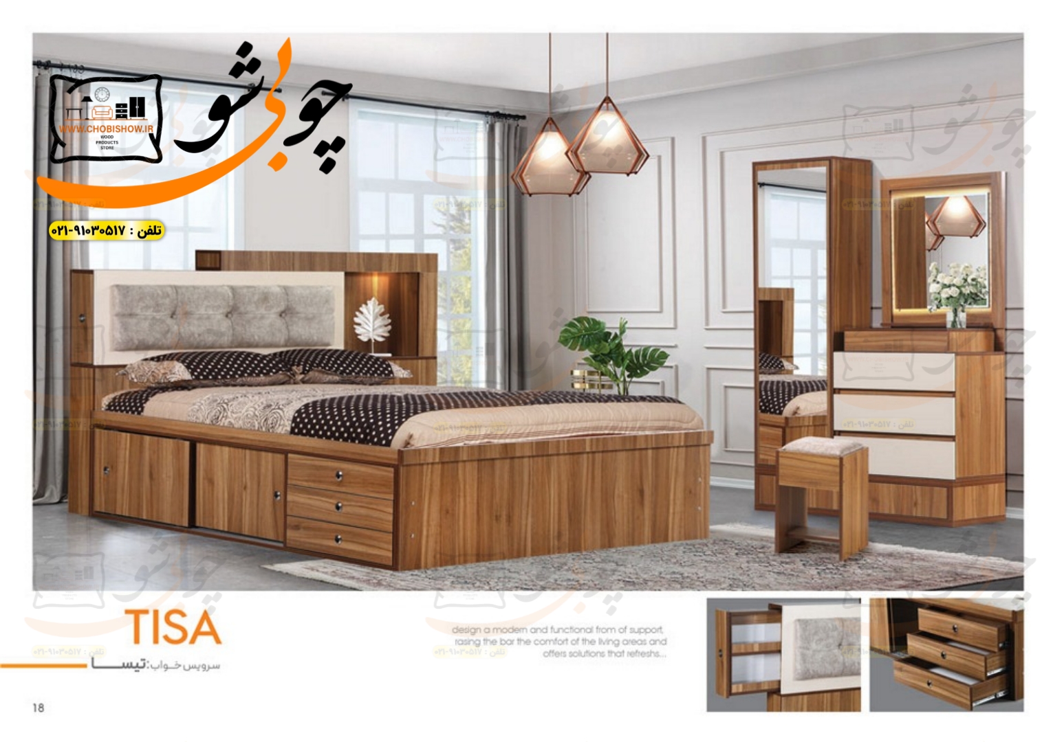 سرویس خواب مدل تیسا، ترکیبی بینظیر از زیبایی و راحتی برای اتاق خواب شماست. با طراحی مدرن و استفاده از متریال باکیفیت، تجربهی خوابی آرام و لذتبخش را هدیه میدهد. شما عزیزان میتوانید به راحتی از طریق همین صفحه این سرویس خواب زیبا را ثبت سفارش کنید تا گروه تولید چوبی شو فقط در مدت زمان ۲۰ روز کاری این سرویس خواب زیبا را تولید و به دست شما عزیزان در هر نقطه از کشور برساند. شما عزیزان برای سوالات و مشاوره میتوانید با پشتیبانی ۲۴ ساعته گروه تولید چوبیشو به شماره ۰۲۱۹۱۰۳۰۵۱۷ (داخلی ۱۰۰) تماس حاصل فرمایید. بدیهیست همکاران ما به تمام سوالات شما در مورد سرویس خواب تیسا پاسخی کامل خواهند داد. شماره واتساپ ۰۹۱۲۴۱۳۴۵۹۰ . اکنون زیبایی و آسایش را به فضای خواب خود بیاورید و با انتخاب تیسا، کیفیت زندگی خود را ارتقا دهید.