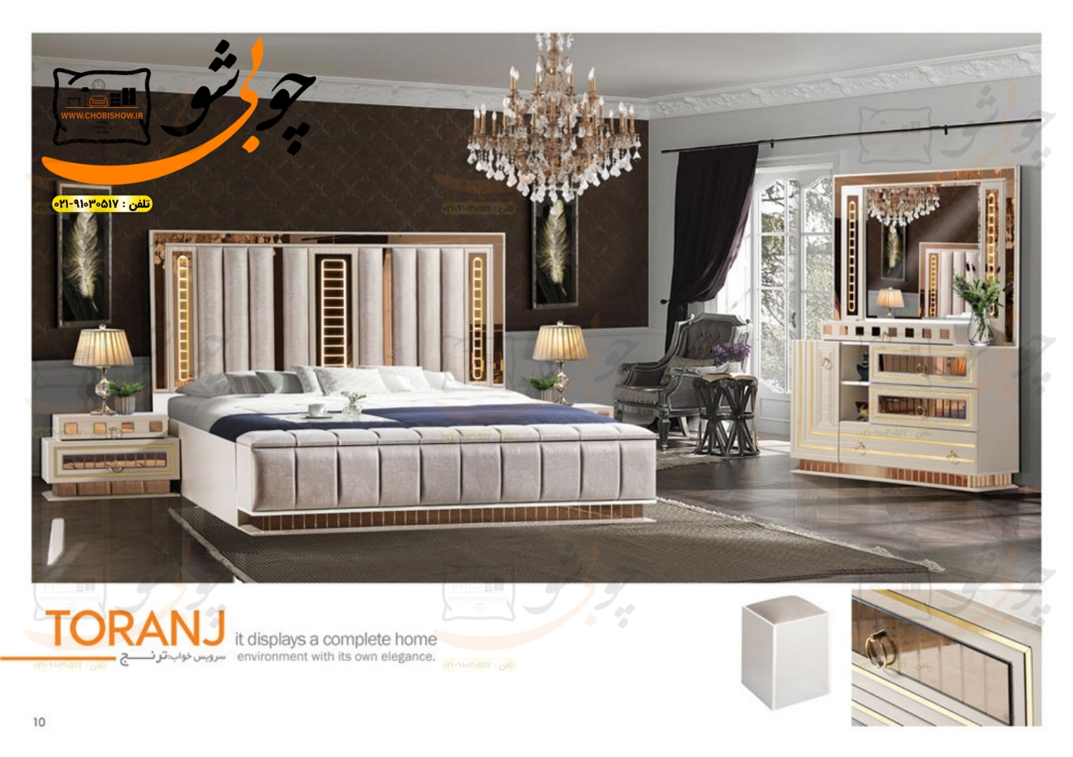 با سرویس خواب مدل ترنج، تجربهای از آرامش و زیبایی را به اتاقخواب خود بیاورید. طراحی شیک و منحصر بهفرد آن، فضای شما را دگرگون میکند. از مواد باکیفیت ساختهشده تا آسایش و دوام طولانیمدت را به شما هدیه دهد. شما عزیزان میتوانید به راحتی از طریق همین صفحه این سرویس خواب زیبا را با رنگ پارچه دلخواه ثبت سفارش کنید تا گروه تولید چوبی شو فقط در مدت زمان ۲۰ روز کاری این سرویس خواب زیبا را با رنگ درخواستی شما تولید و به دست شما عزیزان در هر نقطه از کشور برساند. شما عزیزان برای سوالات و مشاوره میتوانید با پشتیبانی ۲۴ ساعته گروه تولید چوبیشو به شماره ۰۲۱۹۱۰۳۰۵۱۷ تماس حاصل فرمایید. بدیهیست همکاران ما به تمام سوالات شما در مورد سرویس خواب ترنج پاسخی کامل خواهند داد. شماره واتساپ ۰۹۱۲۴۱۳۴۵۹۰ . همین حالا خرید کنید و تجربهای نوین از خواب را آغاز کنید! 01