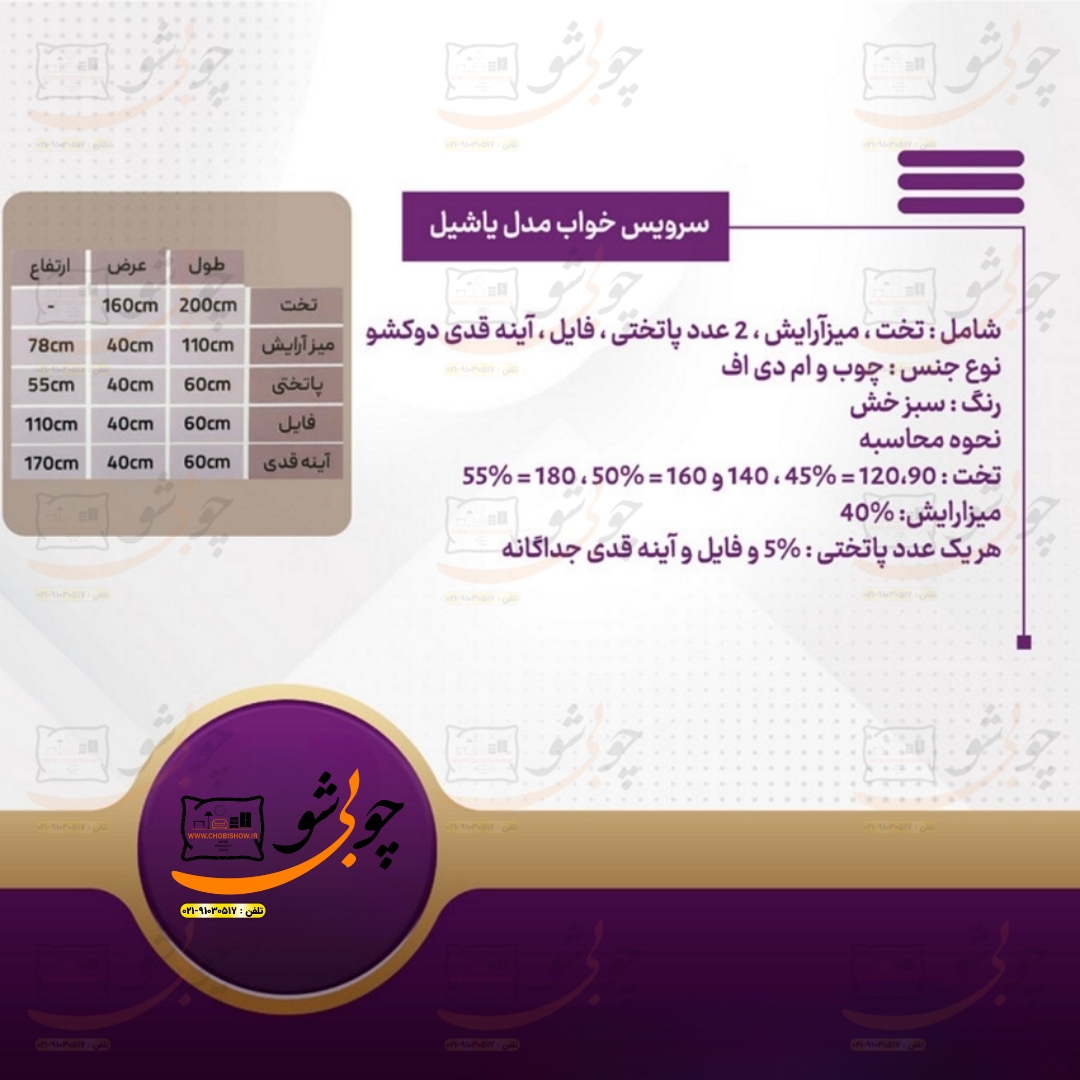 کمپانی چوبی شو یک سیستم یکپارچه تولید محصولات دکوراسیون میباشد که به راحتی جهت رفاه مشتریان عزیز محصولات خود را با قیمت تولید مستقیماً از طریق وب سایت رسمی خود www.chobishow.ir به شما عزیزان ارائه میکند. سرویس خواب مدل یاشیل از تولیدات جدید کمپانی چوبی شو میباشد که تمامی مراحل ساخت تولید آن در خود کمپانی صورت میپذیرد. جهت انتخاب رنگ بعد از ثبت سفارش شما همکاران ما در پشتیبانی تماس گرفته و مشاوره کاملی را خدمت شما عزیزان ارائه میدهند.