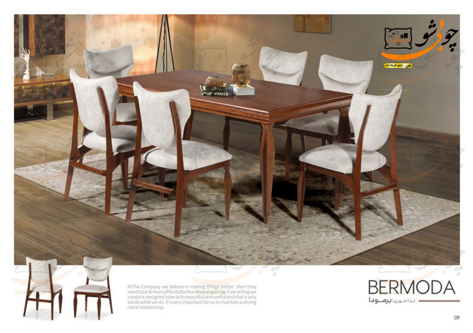 با میز و صندلی ناهار خوری برمودا از جنس چوب راش، لحظات غذا خوردن خود را به تجربهای لوکس تبدیل کنید. طراحی شیک و کیفیت بینظیر این مجموعه، زیبایی و دوام را به فضای شما هدیه میدهد. ایدهآل برای دورهمیهای خانوادگی و مهمانیها. شما عزیزان میتوانید به راحتی از طریق همین صفحه این میز و صندلی ناهار خوری زیبا را با رنگ چوب و پارچه دلخواه ثبت سفارش کنید تا گروه تولید چوبی شو فقط در مدت زمان ۱۲ روز کاری این میز و صندلی زیبا را با رنگ درخواستی شما تولید و به دست شما عزیزان در هر نقطه از کشور برساند. شما عزیزان برای سوالات و مشاوره میتوانید با پشتیبانی ۲۴ ساعته گروه تولید چوبیشو به شماره ۰۲۱۹۱۰۳۰۵۱۷ تماس حاصل فرمایید. بدیهیست همکاران ما به تمام سوالات شما در مورد میز و صندلی ناهارخوری برمودا پاسخی کامل خواهند داد. شماره واتساپ ۰۹۱۲۴۱۳۴۵۹۰ . فرصت را از دست ندهید و همین حالا خرید کنید! 01