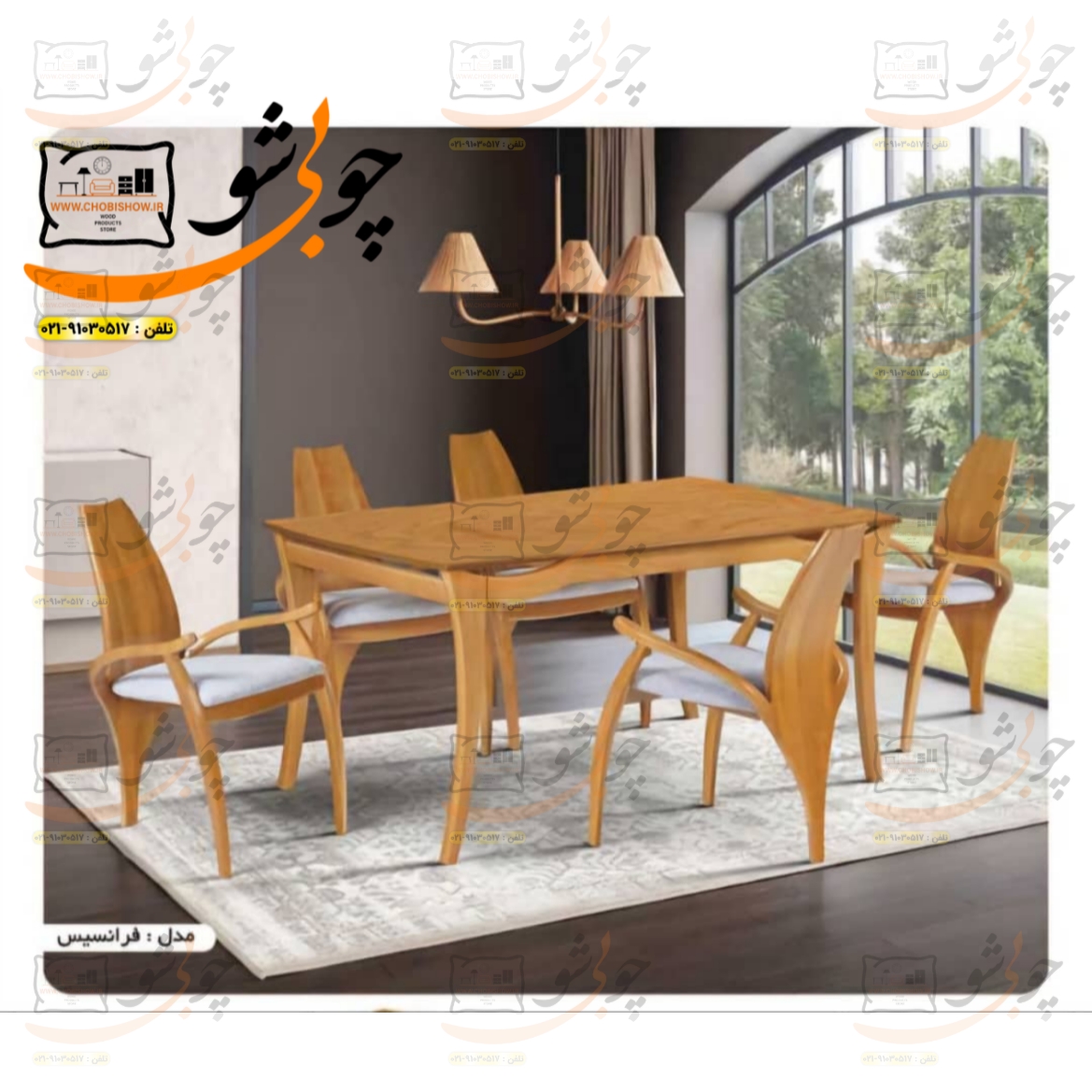 کمپانی چوبی شو یک سیستم یکپارچه تولید محصولات دکوراسیون میباشد که به راحتی جهت رفاه مشتریان عزیز محصولات خود را با قیمت تولید مستقیماً از طریق وب سایت رسمی خود www.chobishow.ir به شما عزیزان ارائه میکند. میز و صندلی ناهار خوری مدل فرانسیس از تولیدات جدید کمپانی چوبی شو میباشد که تمامی مراحل ساخت تولید آن در خود کمپانی صورت میپذیرد. جهت انتخاب رنگ بعد از ثبت سفارش شما همکاران ما در پشتیبانی تماس گرفته و مشاوره کاملی را خدمت شما عزیزان ارائه میدهند.