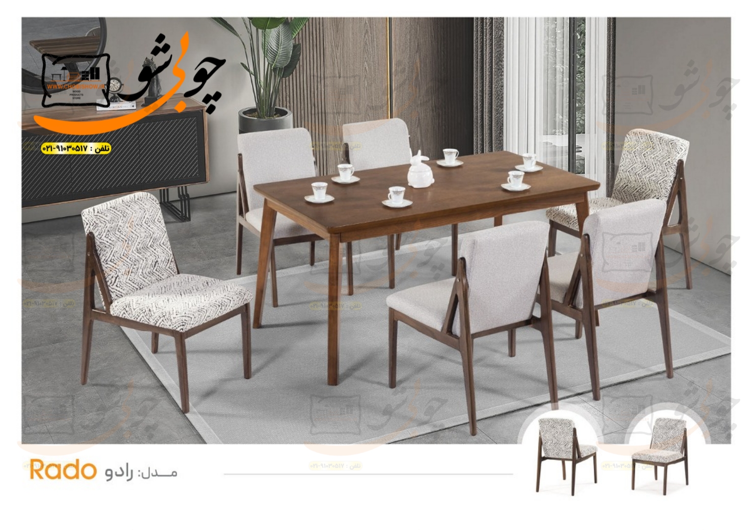 با میز و صندلی ناهارخوری مدل رادو، زیبایی و عملکرد را به خانه خود بیاورید! طراحی مدرن و ارگونومیک آن، هر وعده غذایی را به تجربهای لذتبخش تبدیل میکند. ساختهشده از مواد باکیفیت برای دوام بیشتر، این مجموعه فضای شما را شیک و دلپذیر میسازد. شما عزیزان میتوانید به راحتی از طریق همین صفحه این میز و صندلی ناهار خوری زیبا را با رنگ پارچه دلخواه ثبت سفارش کنید تا گروه تولید چوبی شو فقط در مدت زمان ۱۵ روز کاری این میز و صندلی زیبا را با رنگ درخواستی شما تولید و به دست شما عزیزان در هر نقطه از کشور برساند. شما عزیزان برای سوالات و مشاوره میتوانید با پشتیبانی ۲۴ ساعته گروه تولید چوبیشو به شماره ۰۲۱۹۱۰۳۰۵۱۷ (داخلی ۱۰۰) تماس حاصل فرمایید. بدیهیست همکاران ما به تمام سوالات شما در مورد میز و صندلی ناهارخوری رادو پاسخی کامل خواهند داد. شماره واتساپ ۰۹۱۲۴۱۳۴۵۹۰ . همین امروز زیبایی و راحتی را به خانهتان بیاورید!