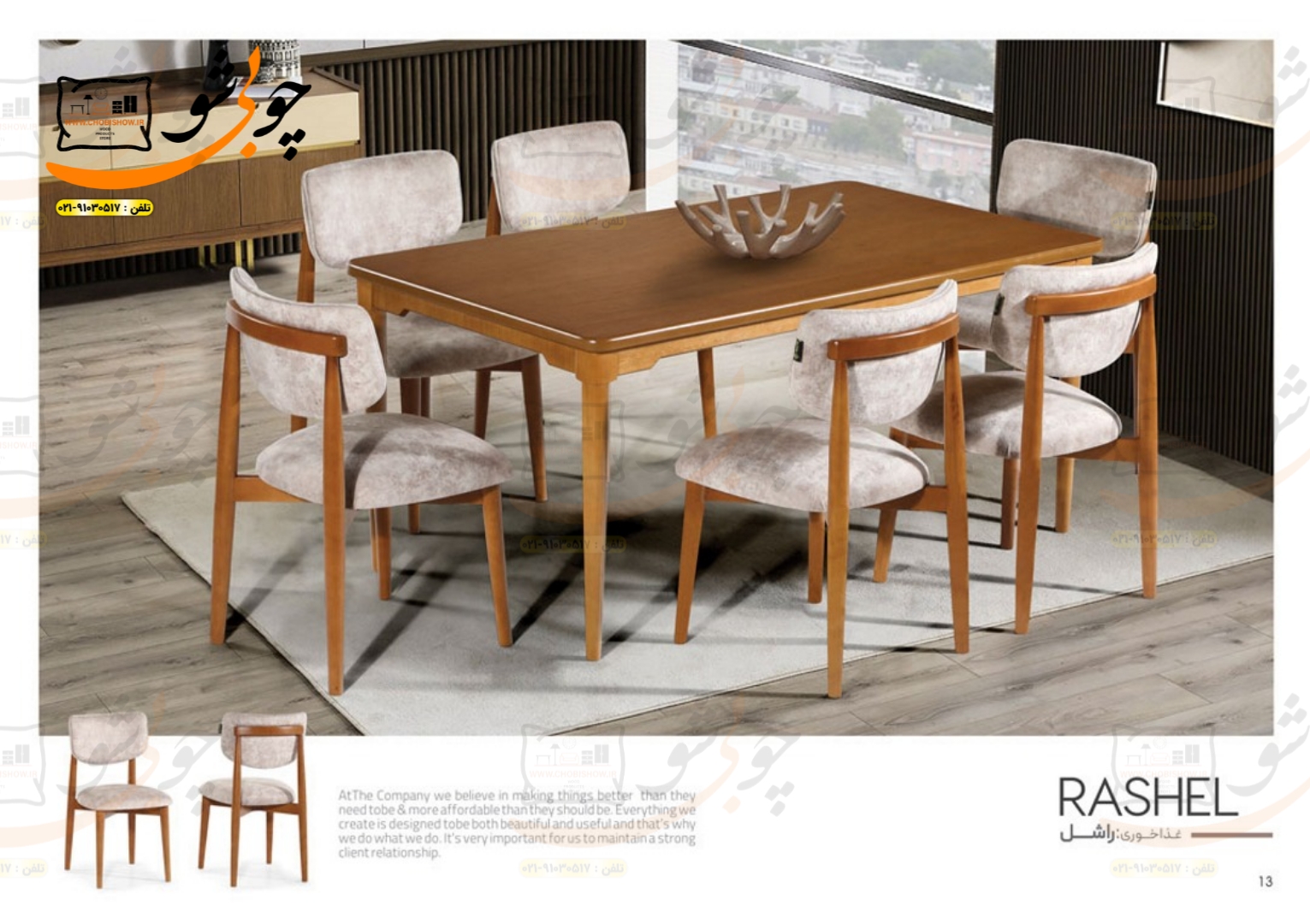 میز و صندلی ناهارخوری مدل راشل، با ظاهری شیک و متریال تمام راش، انتخابی ایدهآل برای دکوراسیون منزل شماست. ظرافت در طراحی و کیفیت بالا، این مجموعه را به گزینهای بینظیر برای تجربهای لوکس و ماندگار تبدیل کرده است. شما عزیزان میتوانید به راحتی از طریق همین صفحه این میز و صندلی ناهار خوری زیبا را با رنگ چوب و پارچه دلخواه ثبت سفارش کنید تا گروه تولید چوبی شو فقط در مدت زمان ۱۲ روز کاری این میز و صندلی زیبا را با رنگ درخواستی شما تولید و به دست شما عزیزان در هر نقطه از کشور برساند. شما عزیزان برای سوالات و مشاوره میتوانید با پشتیبانی ۲۴ ساعته گروه تولید چوبیشو به شماره ۰۲۱۹۱۰۳۰۵۱۷ تماس حاصل فرمایید. بدیهیست همکاران ما به تمام سوالات شما در مورد میز و صندلی ناهارخوری راشل پاسخی کامل خواهند داد. شماره واتساپ ۰۹۱۲۴۱۳۴۵۹۰ . همین حالا این ترکیب استثنایی را به خانهتان بیاورید و لحظات خوشایندی را تجربه کنید! 01